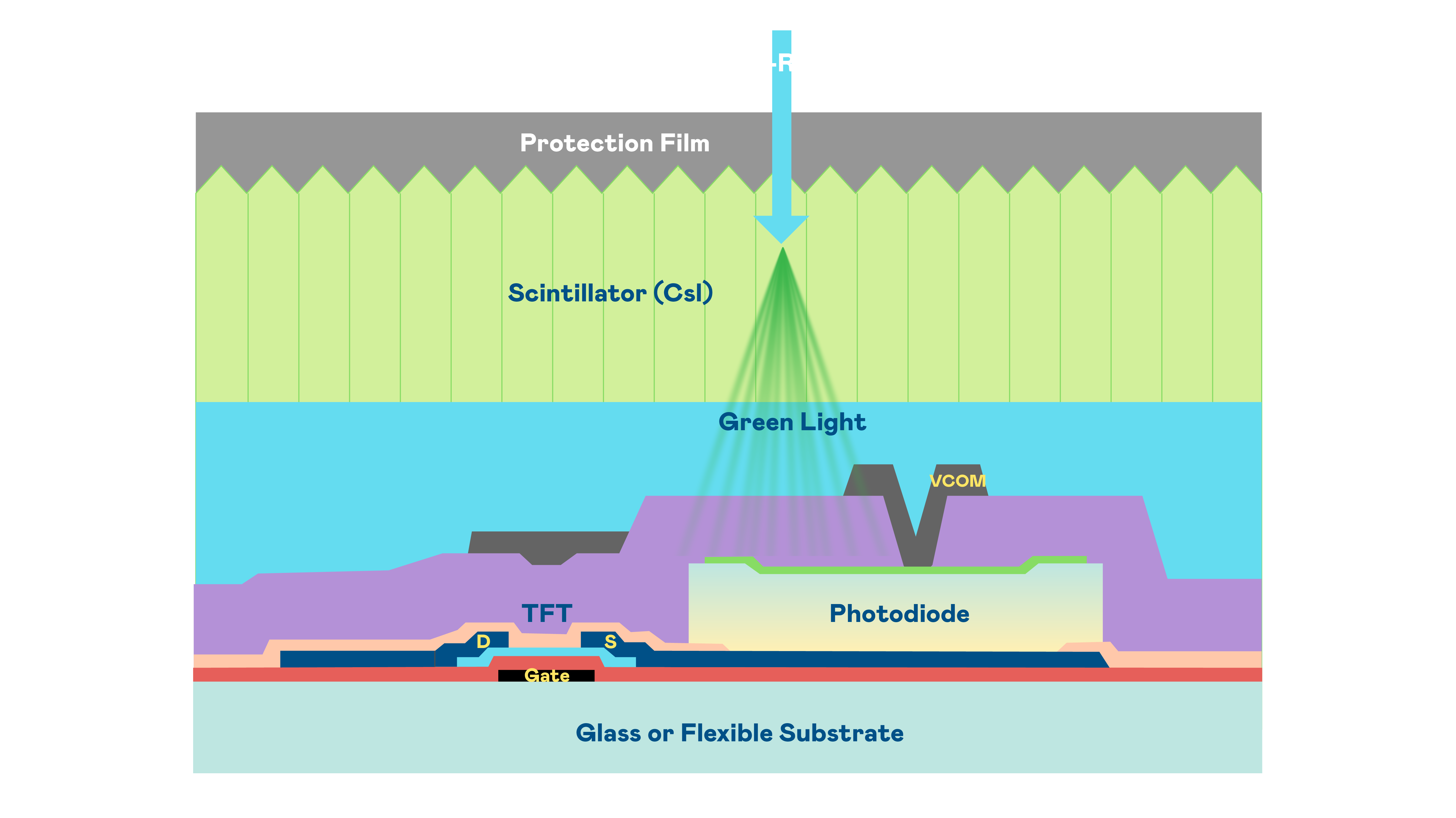 AG视讯的X光影像感測陣列使用薄膜電晶體 (TFT) 作為每個像素的讀取開關,搭配光電二極體(Photodiode)的光電轉換元件,用以感測X光影像訊號。